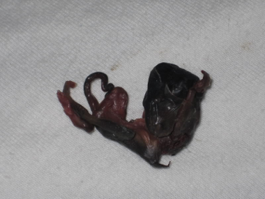 We got to the vet and she tried and tried and couldn't get that kit out. She had to take a pair of scissors and slice him/her in half then work the head out slowly while mom was just whimpering in pain. The problem is, the head was in the birth canal, it HAD to come out and she wasn't sure she could reach it surgically. The smell was horrendous. It just permeated the room. The kits had obviously been dead in mom a long time. There was pus and blood all over the place. I have a strong stomach, I can watch pretty much anything, but when she got the scissors out I left the room. I was nauseated beyond words from being ill, then stretching that little baby out myself, and I couldn't take any more.